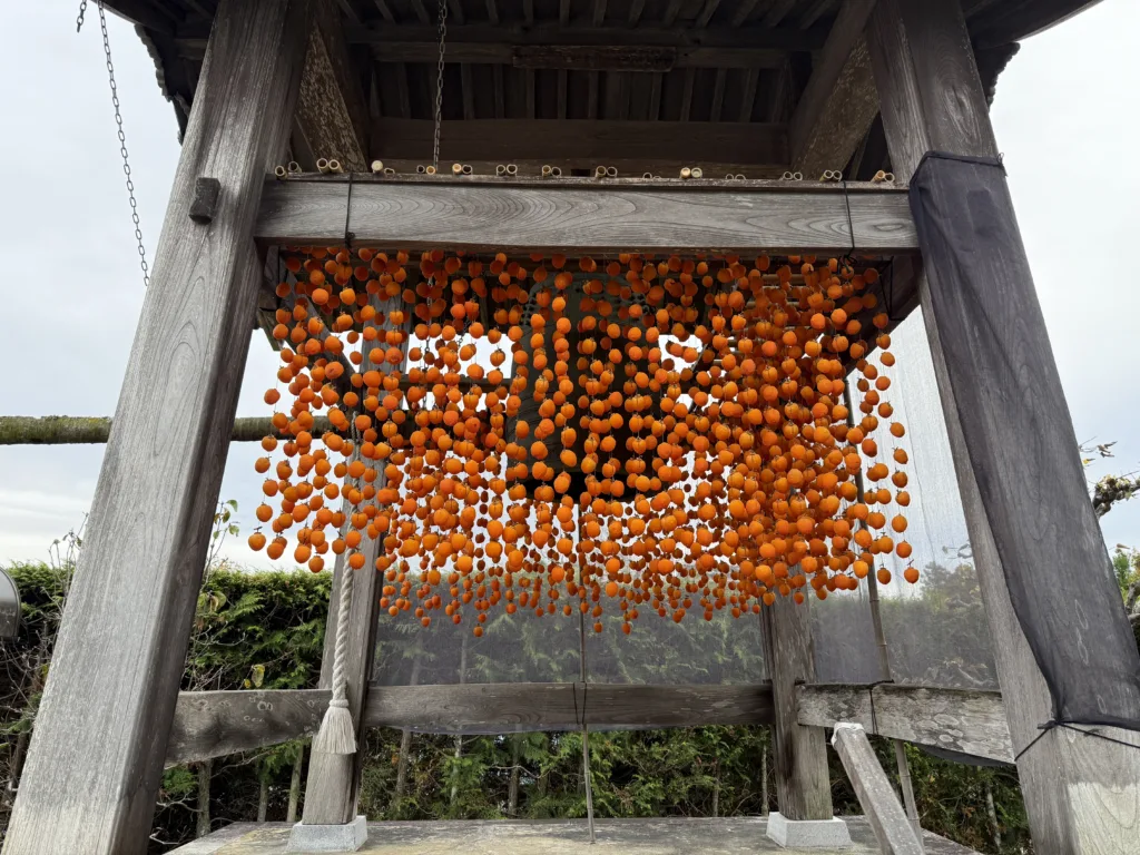 • 一般の農家の軒先とは異なり、こちらのお寺では鐘を鳴らす台(鐘楼)に柿すだれが吊るされるという、非常にユニークで美しい風景が見られます。