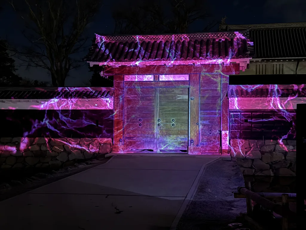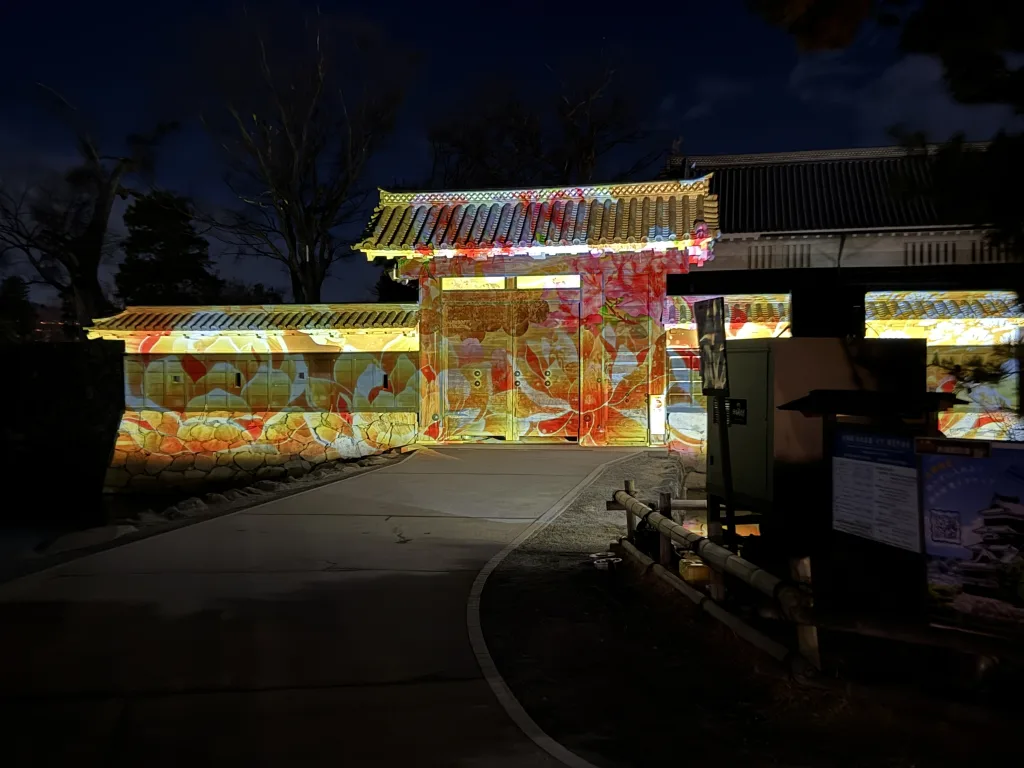 昨年(2024-2025年開催)のイベントでは、天守閣のマッピングに加えて、黒門や太鼓門などの城門も季節のカラーでライトアップされる演出が確認されました。