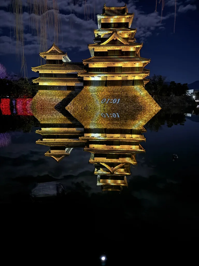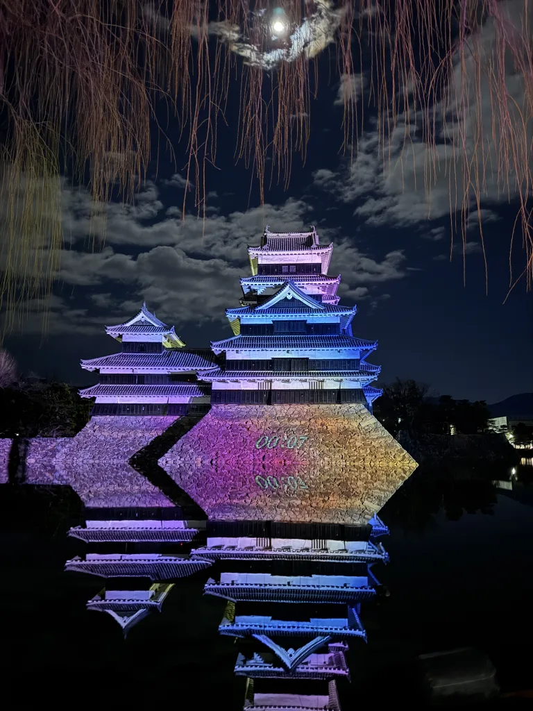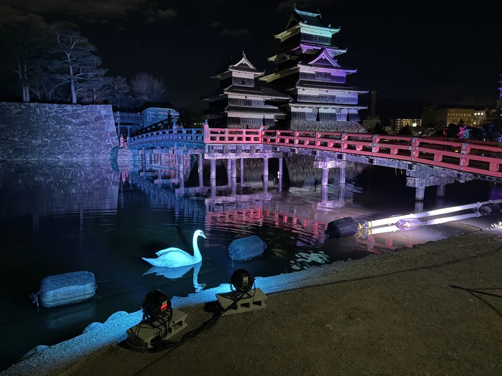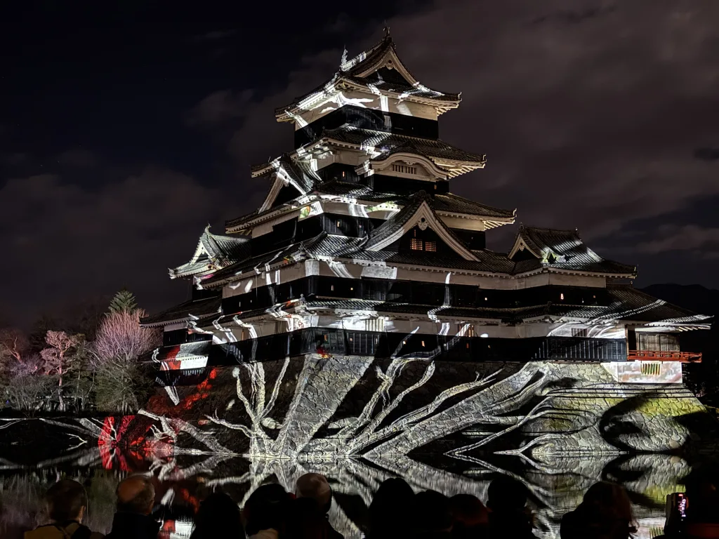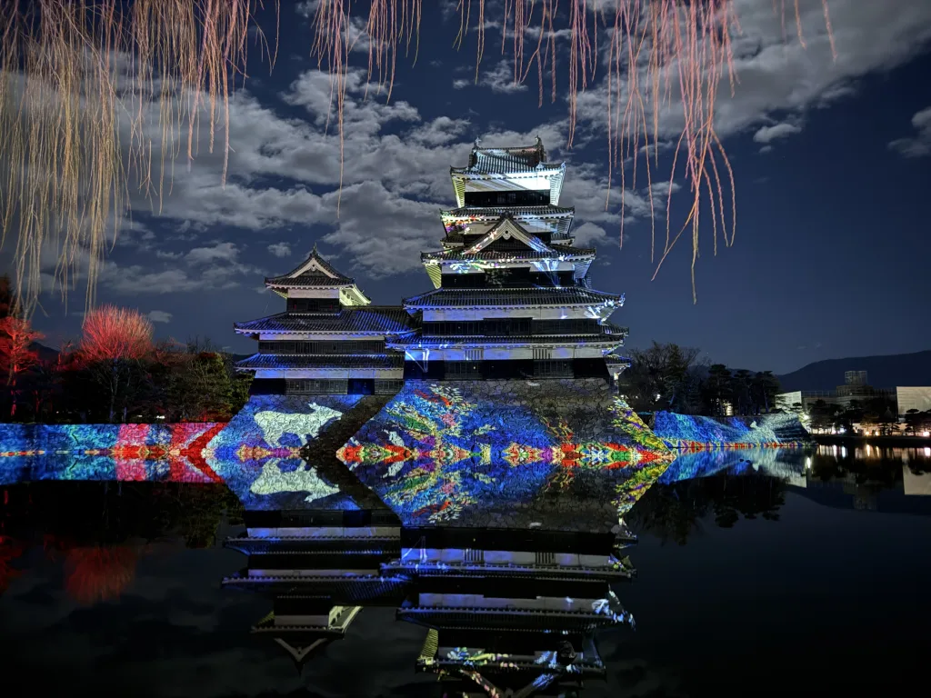 冬の国宝松本城を彩るプロジェクションマッピングは、黒と白の天守閣がお堀の水面に映る姿が圧巻の美しさです。