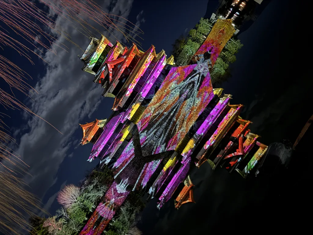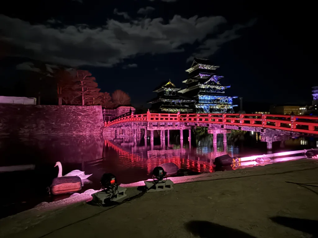 エプソンの技術と一旗の演出力が融合することで、国宝の黒漆喰と白壁を鮮やかに彩る、圧倒的な光の表現が実現しています。