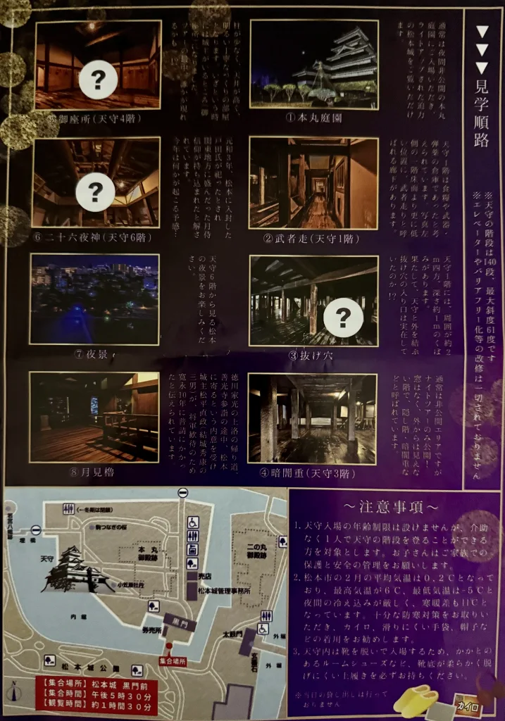 - 松本城に最も近い市営開智駐車場は、利用時間が18:00までとなっており、夜間イベントの時間帯には出庫できなくなるため、絶対に利用しないでください。