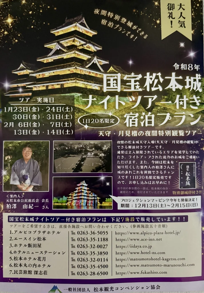 - このツアー付き宿泊プランは、アルピコプラザホテルなど、7施設で販売されています。