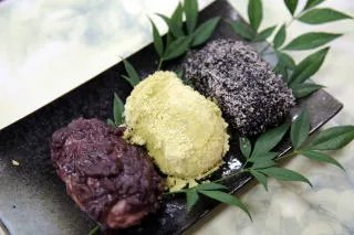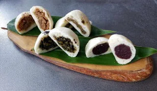 - 三種の力餅(430円)、手作りおやき(各150円)。
