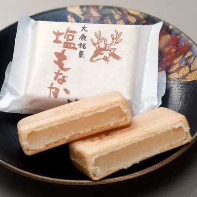 - 【その場で味わう絶品グルメ】 大鹿唐辛子、塩もなか(180円)。