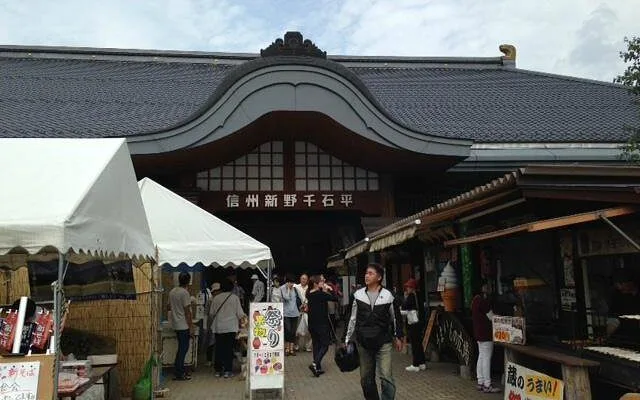 千曲川のほとりに位置し、春には菜の花、秋にはコスモスが咲き誇る絶好のロケーション。モンベル飯山店を併設し、アウトドアアクティビティの拠点としても非常に人気が高いスポットです。